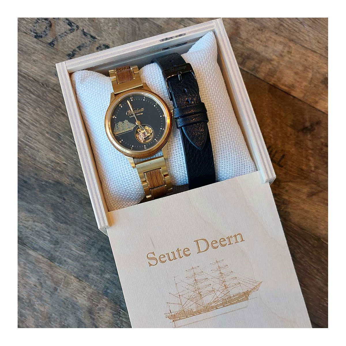 Diese Automatikuhr aus dem altehrwürdigen Schiffsholz der Seute Deern - Plattdeutsch für hübsches Mädchen  - ist ein wunderschönes Schmuckstück für die Damenwelt. Durch die Einarbeitung der gut erhaltenen Resthölzer erwerben Sie mit diesem Zeitmesser eine bleibende Erinnerung an die SEUTE DEERN, dem Wahrzeichen Bremerhavens. Die goldfarbene Veredelung auf der Lünette, dem Ziffernblatt und auch dem Uhrband, machen diese Damenautomatikuhr besonders edel und anmutig. Ihr Inneres ist mit einem präzisen, nachhaltigen Automatikuhrwerk ausgestattet und auf dem dunklen mystischen Ziffernblatt ist zudem die original getreue Bauskizze der Seute Deern verewigt. Außerdem verfügt die Damenholzuhr über ein Saphirglas und ein Echtheitszertifikat aus Stahl. Seriennummer und Wechselband aus schwarzem Leder rund das wunderschöne Set ab.