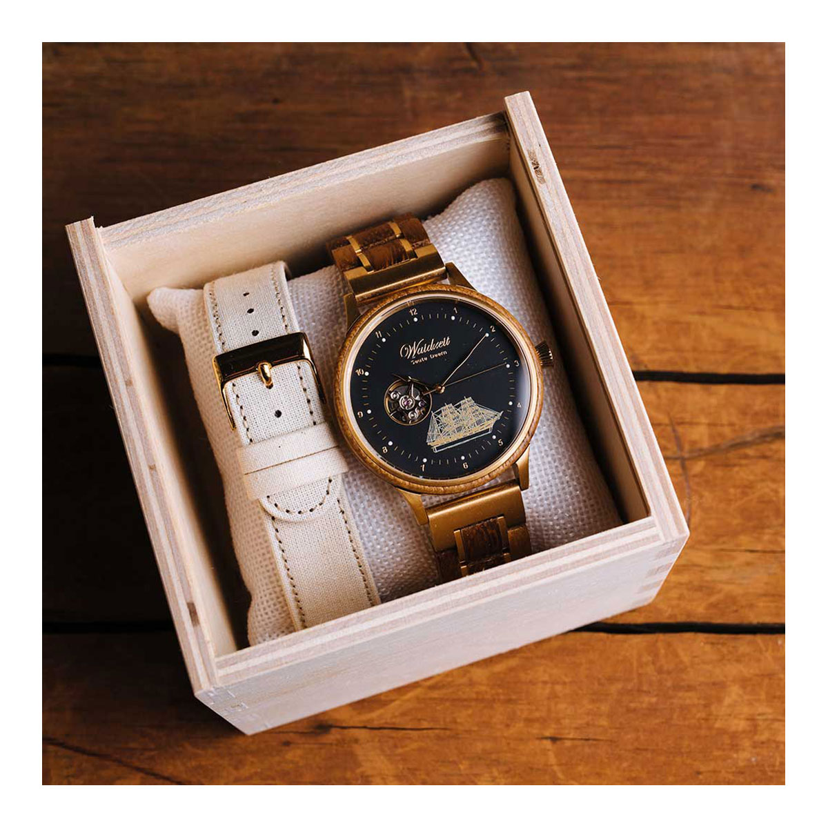 Sie besitzt ein hochwertiges Automatikuhrwerk, Saphirglas und Sichtfenster auf das Uhrwerk. Zudem hat dieser zeitlos schöne Zeitmesser die Bauzeichnung der Seute Deern, des wohl bekanntesten Schiffes im Bremerhaven auf dem Ziffernblatt abgebildet.