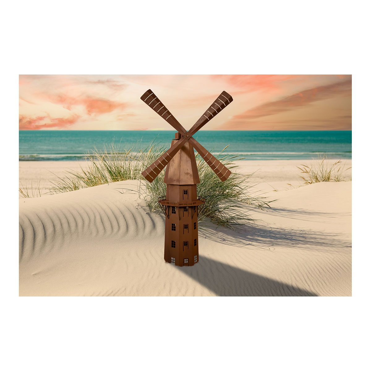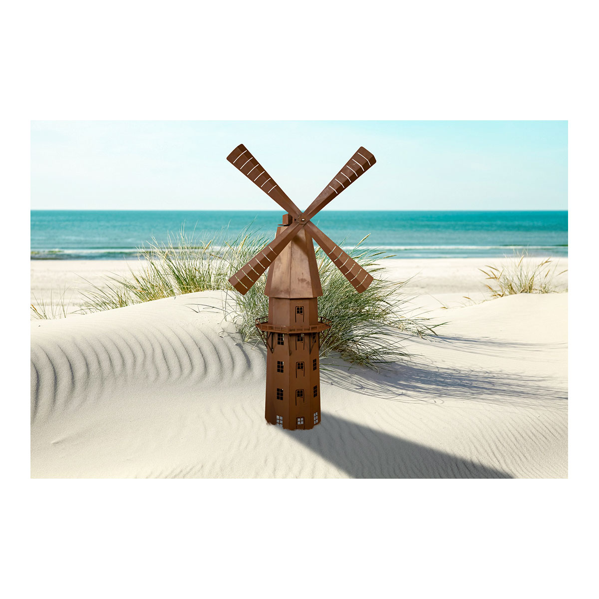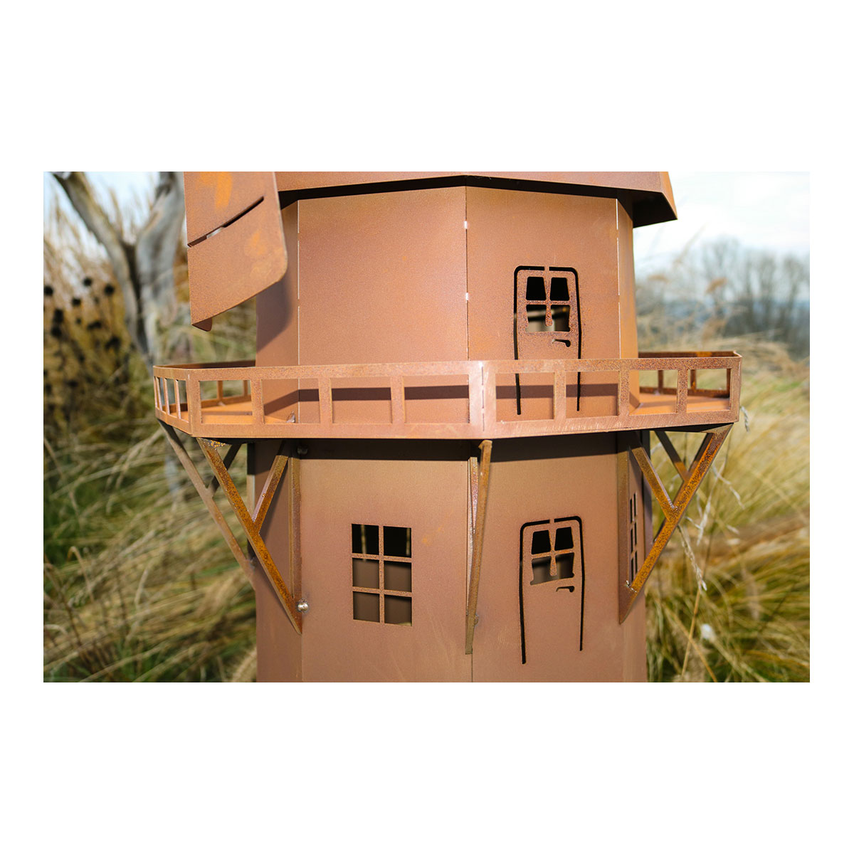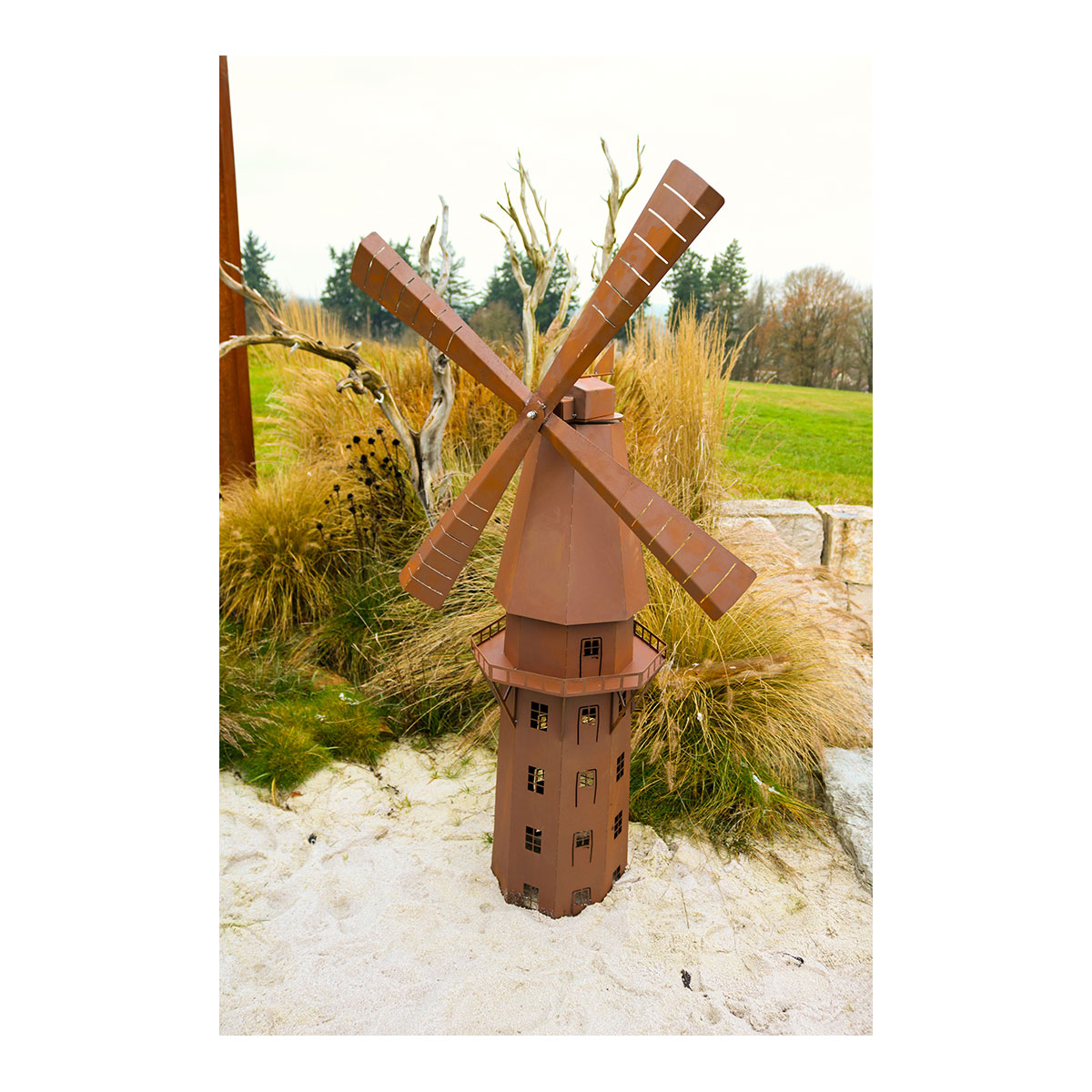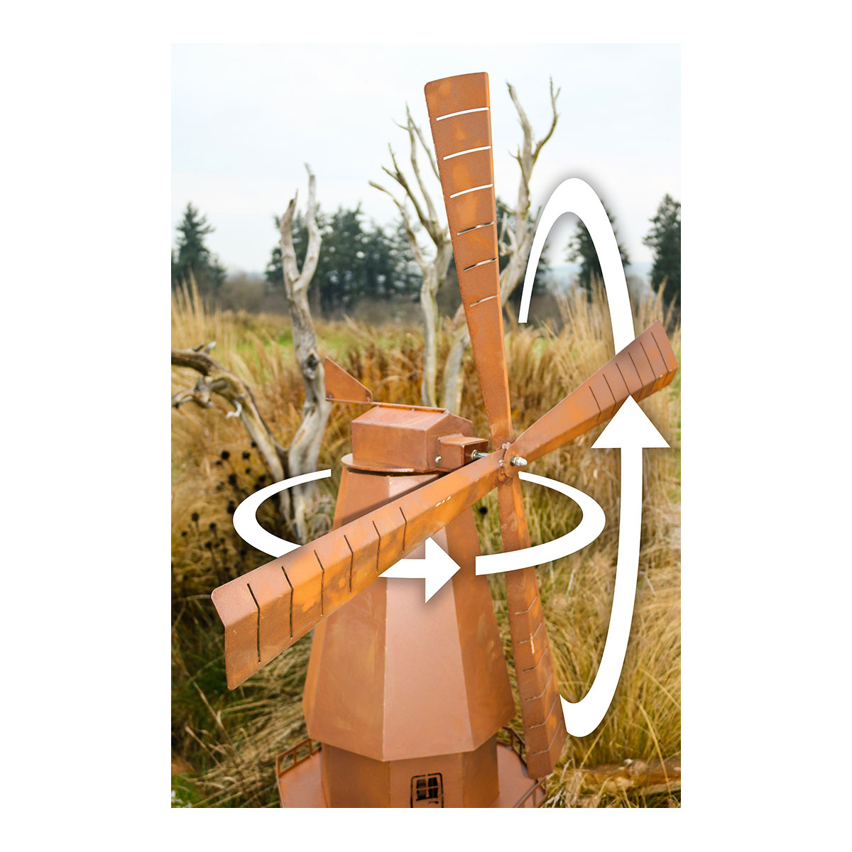 Die Ferrum Art Design Windmühle aus gerostetem Metall ist ein wahrer Blickfang für jeden Garten. Durch die sich drehenden Flügel wird jede Windbewegung zur Sensation. Auch das Dach ist drehbar,