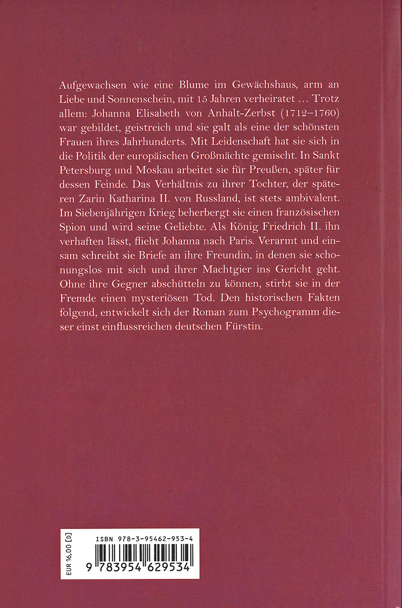 Aufgewachsen wie eine Blume im Gewächshaus, arm an Liebe und Sonnenschein, mit 15 Jahren verheiratet … Trotz allem: Johanna Elisabeth von Anhalt-Zerbst (1712 - 1760) war gebildet, geistreich und sie galt als eine der schönsten Frauen ihres Jahrhunderts. Mit Leidenschaft hat sie sich in die Politik der europäischen Großmächte gemischt. In Sankt Petersburg und Moskau arbeitet sie für Preußen, später für dessen Feinde. Das Verhältnis zu ihrer Tochter, der späteren Zarin Katharina II. von Russland, ist stets ambivalent. Im Siebenjährigen Krieg beherbergt sie einen französischen Spion und wird seine Geliebte. Als König Friedrich II. ihn verhaften lässt, flieht Johanna nach Paris. Verarmt und einsam schreibt sie Briefe an ihre Freundin, in denen sie schonungslos mit sich und ihrer Machtgier ins Gericht geht. Ohne ihre Gegner je abschütteln zu können, stirbt sie in der Fremde einen mysteriösen Tod. Den historischen Fakten folgend, entwickelt sich der Roman zum Psychogramm dieser einst einflussreichen deutschen Fürstin.