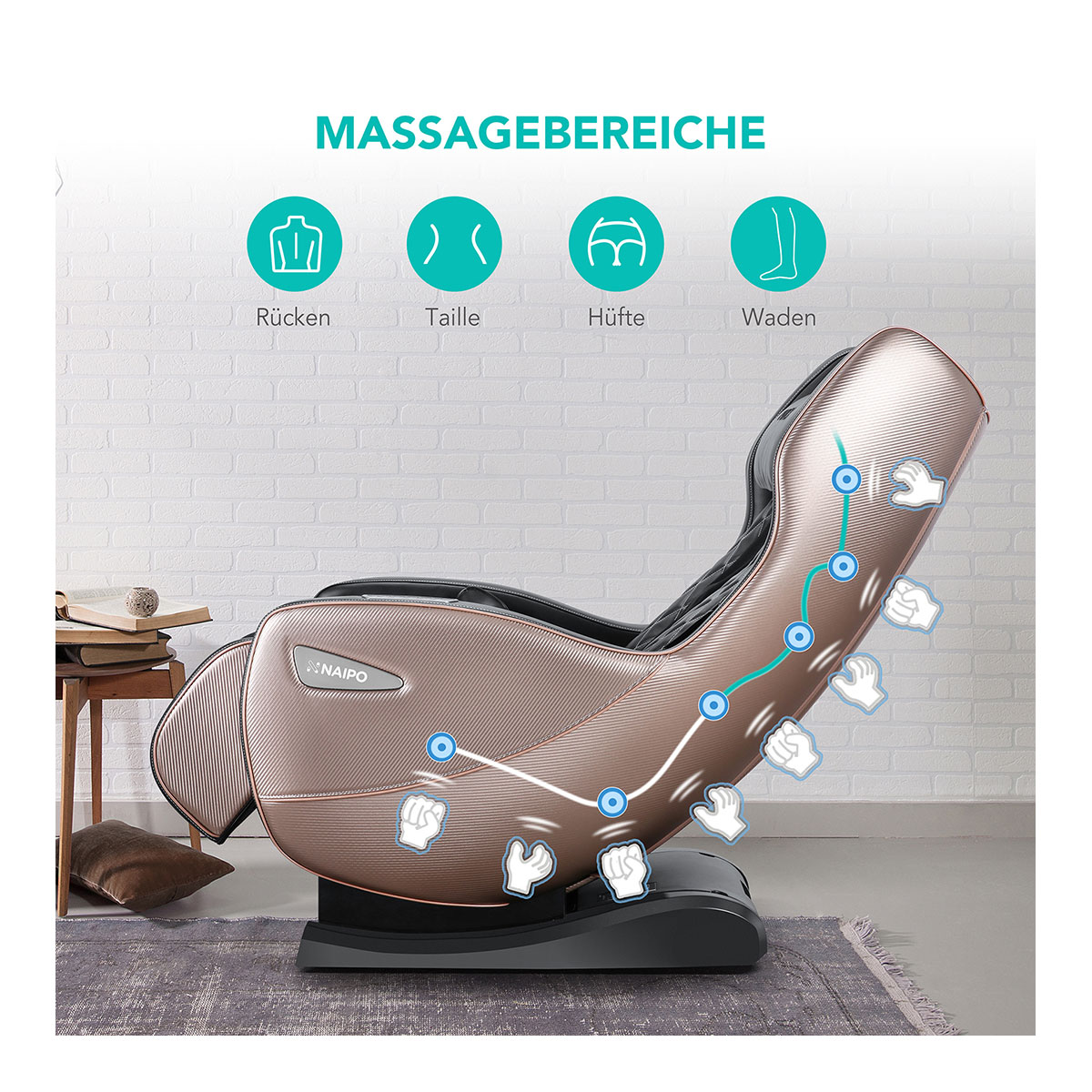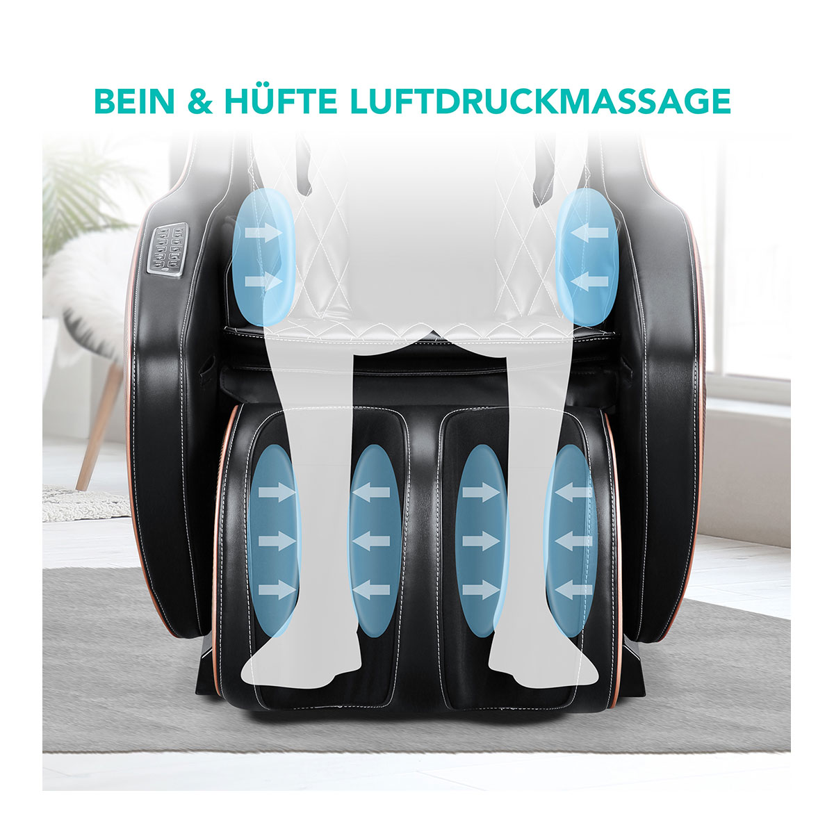 Die Bein- und Hüftbereiche werden von Luftkissen massiert, die sanft und rhythmisch Druck auf- und abbauen.