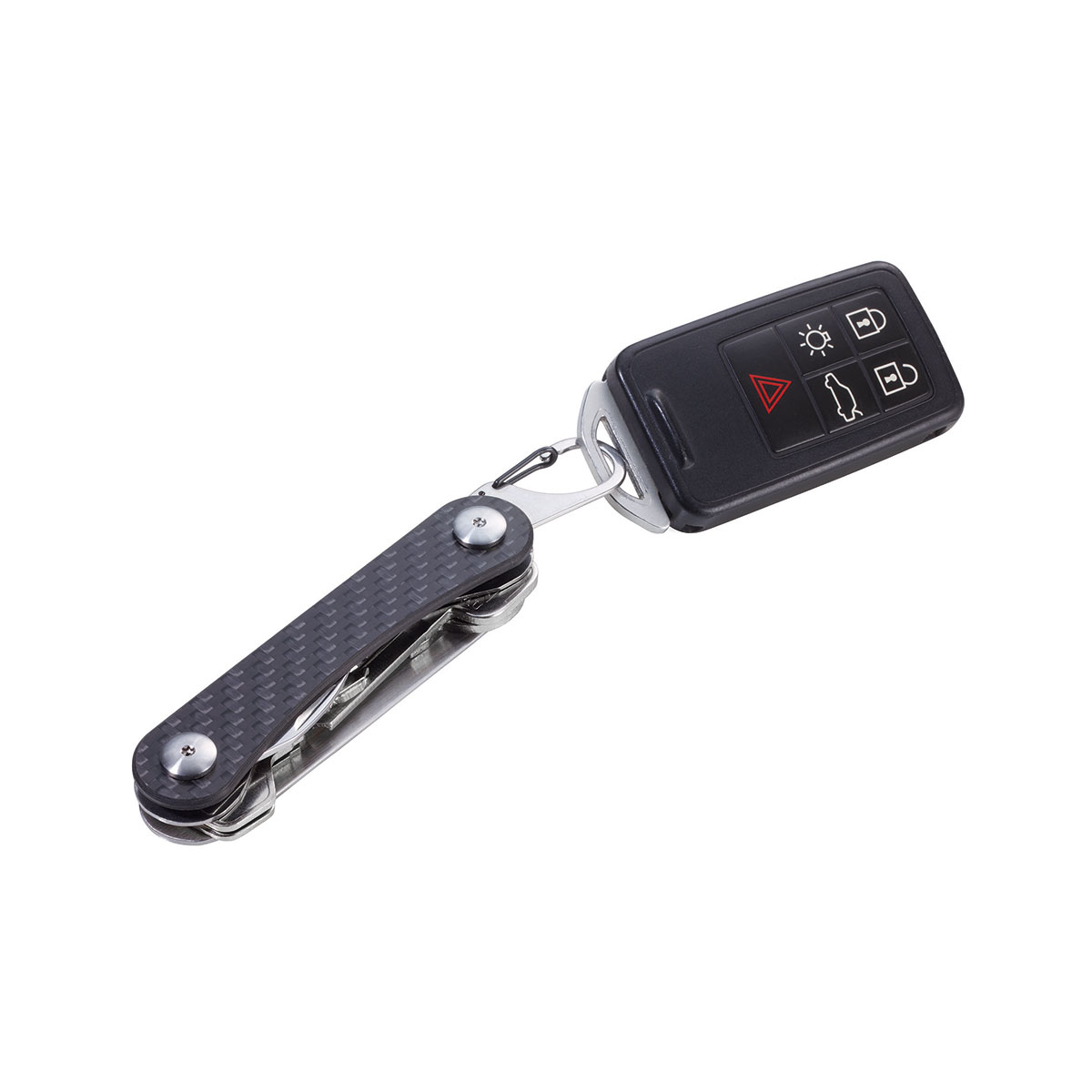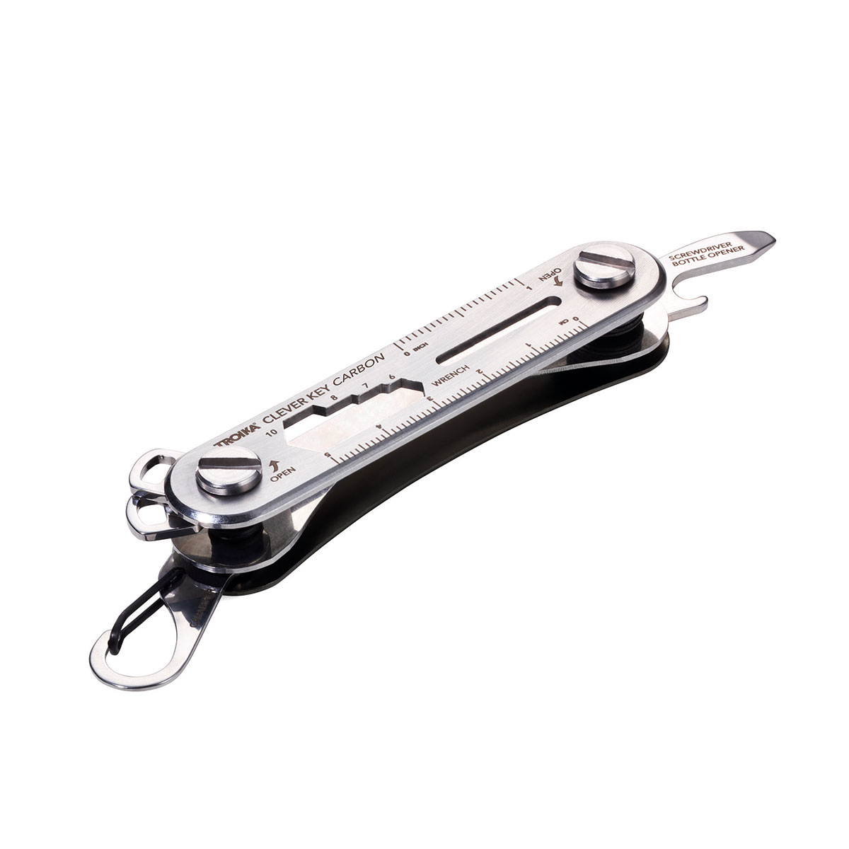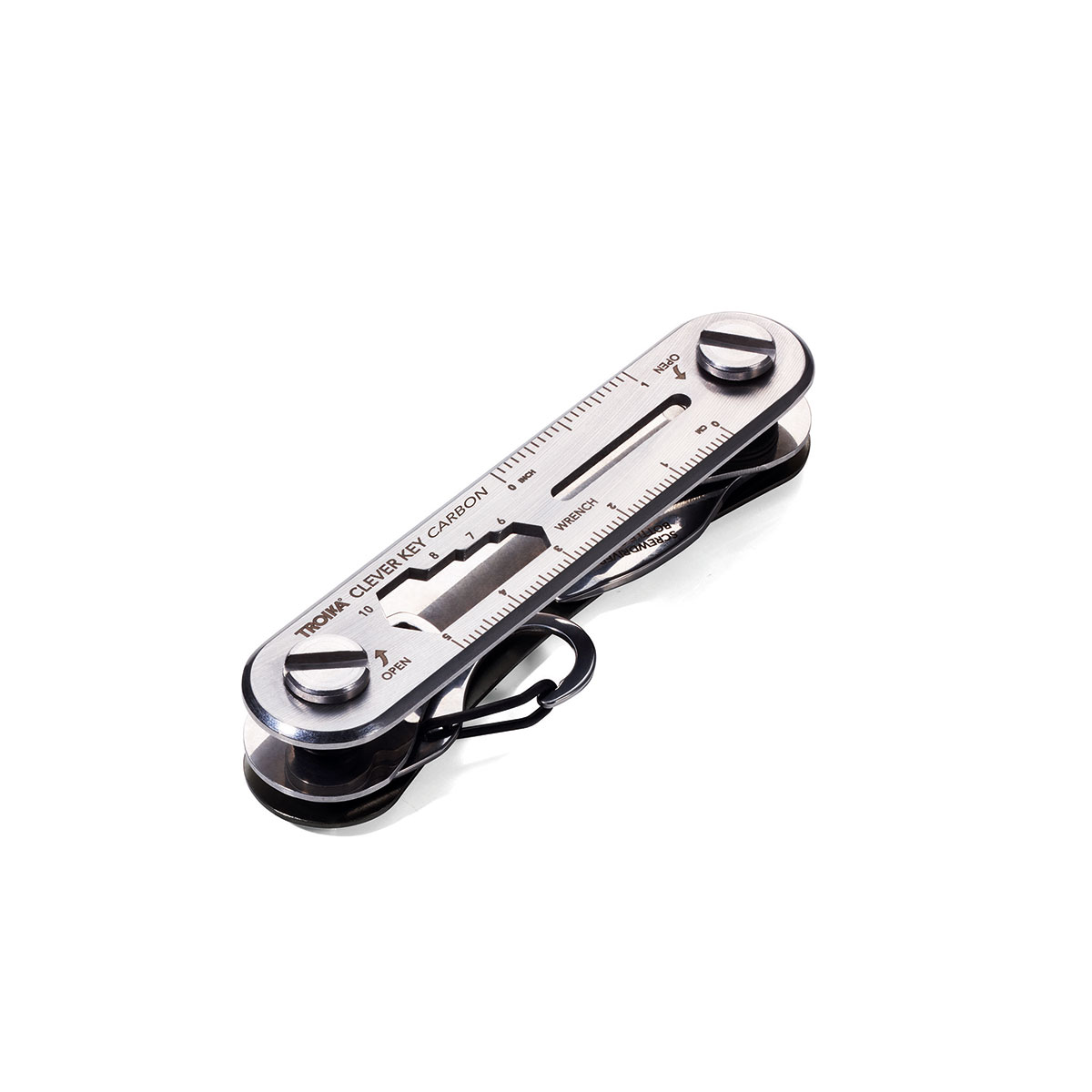 Der Schlüssel-Organizer kommt als Bausatz und bleibt als einer der smartesten Schlüssel-Organizer überhaupt. Schrauben, Distanzringe und Aluminiumschalen lassen sich schnell montieren keine Herausforderung für alle, die sich ein wenig Spieltrieb bewahrt haben. Dann verblüfft der Organizer mit intuitivem Handling und vielen sinnvollen Funktionen. Drei bis sechs Schlüssel lassen sich sicher verstauen. Schraubenschlüssel, Schraubendreher, Karabinerhaken und vieles mehr sind mit an Bord. Und natürlich ein Extra-Schlüsselring für den (etwas dickeren) Autoschlüssel. Die geniale Kombination aus Schlüsselmanagement und Multitool: zum Verschenken fast zu schade! Zusatzfunktionen, Flaschenöffner, Karabinerhaken, Schraubenschlüssel (4 Größen), Schlitz-/Flügelschraubendreher, Zentimeter-/Zoll-Lineal, inkl. Gürteltasche.