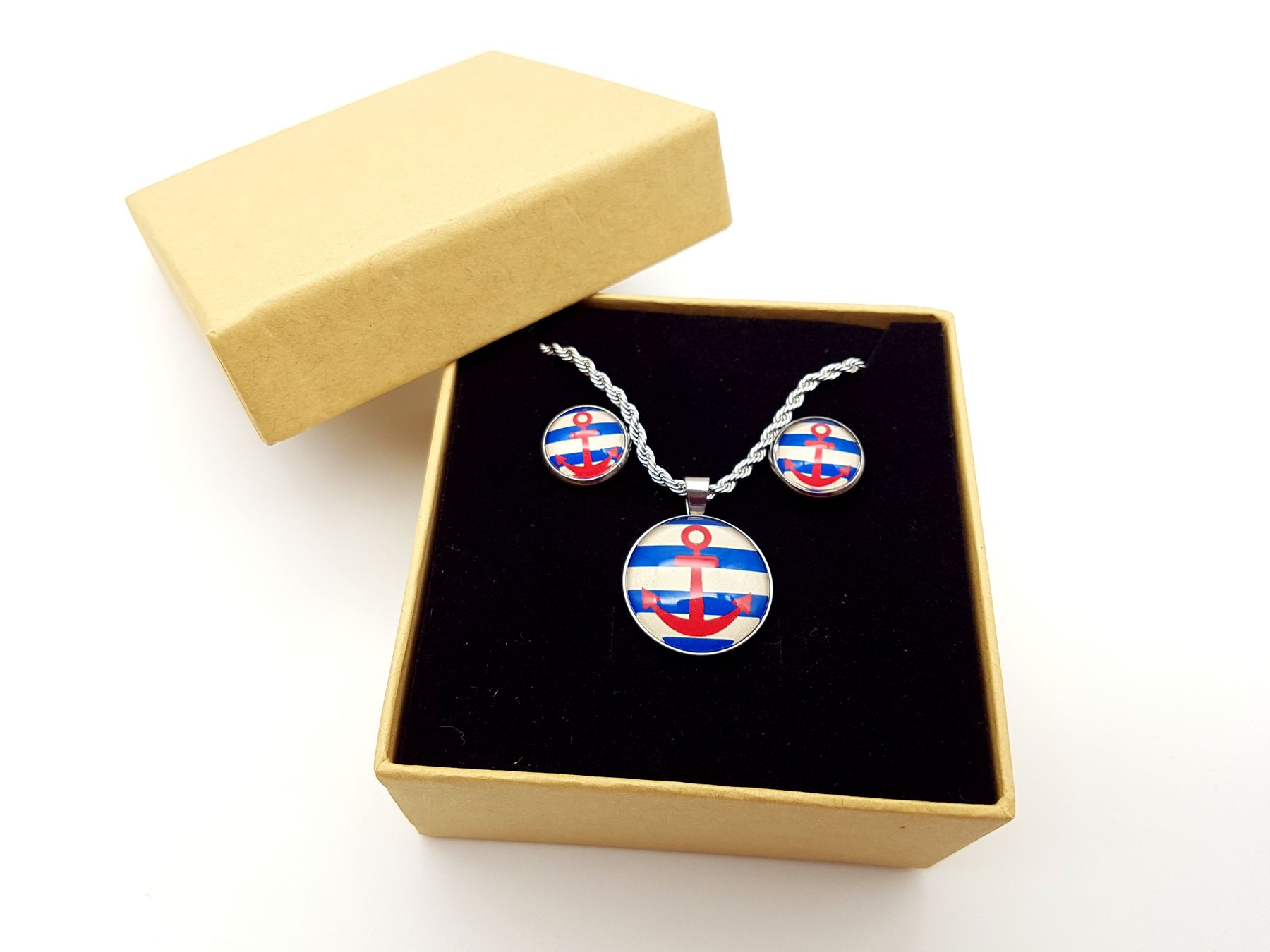 Set aus Ohrstecker. 80cm Kette dick "Anker blau-creme"