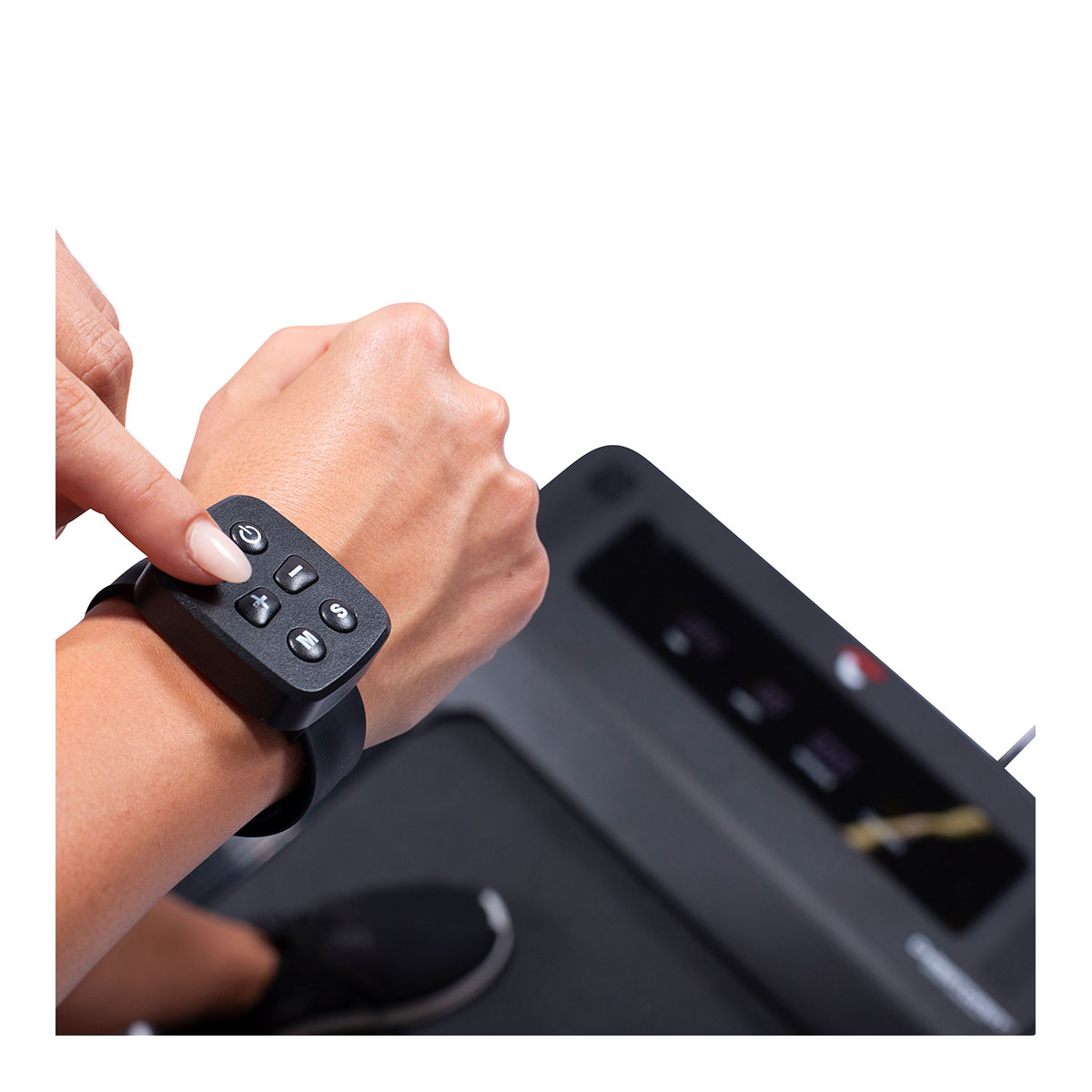 Alle Programme und auch die Geschwindigkeit werden einfach über die mitgelieferte Armband-Fernbedienung eingestellt und gesteuert. Die Geschwindigkeit kann von 1 km/h bis 8 km/h gewählt werden und ist in 0,1-km/h-Schritten einstellbar.